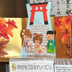 | 最近、待合室の飾り棚に デイケアのスタッフが季節に合った 作品を展示しております。 今回は、七五三の様子を折り紙で 作っております。 なかなかの力作です!! |